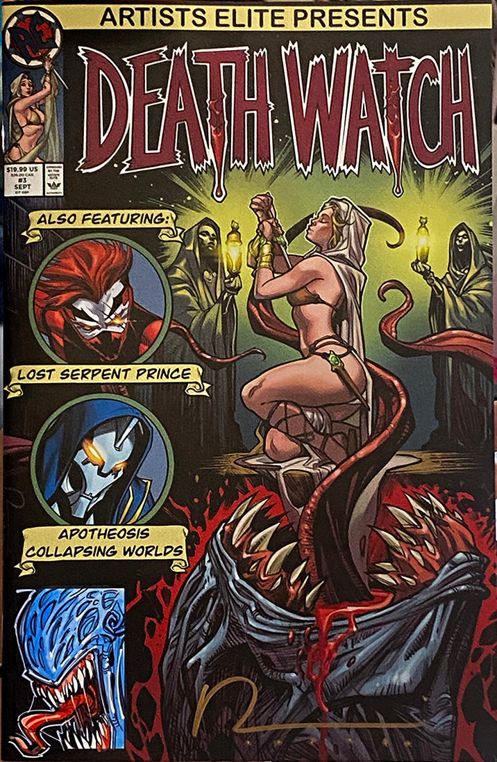 Artists Elite Presents #3 features the premiere of 2 new stories plus Part 2 of Brett Booth's (Teen Titans) Lost Serpent Prince where Basilisk awakens and must prove he’s battle ready before he can cross paths with the assassin Morrighan! Chad Hardin's (Harley Quinn) Death Watch is the tale of a hunter who destroys vampires, werewolves, and demons to keep the people of 19th century Europe safe from a cult determined to bring suffering and eternal darkness to the world. Jordan Gunderson's (Aspen Comics) Apotheosis reveals a complex mystery that stretches back to the dawn of civilization through a young woman's search for answers about her family's past.